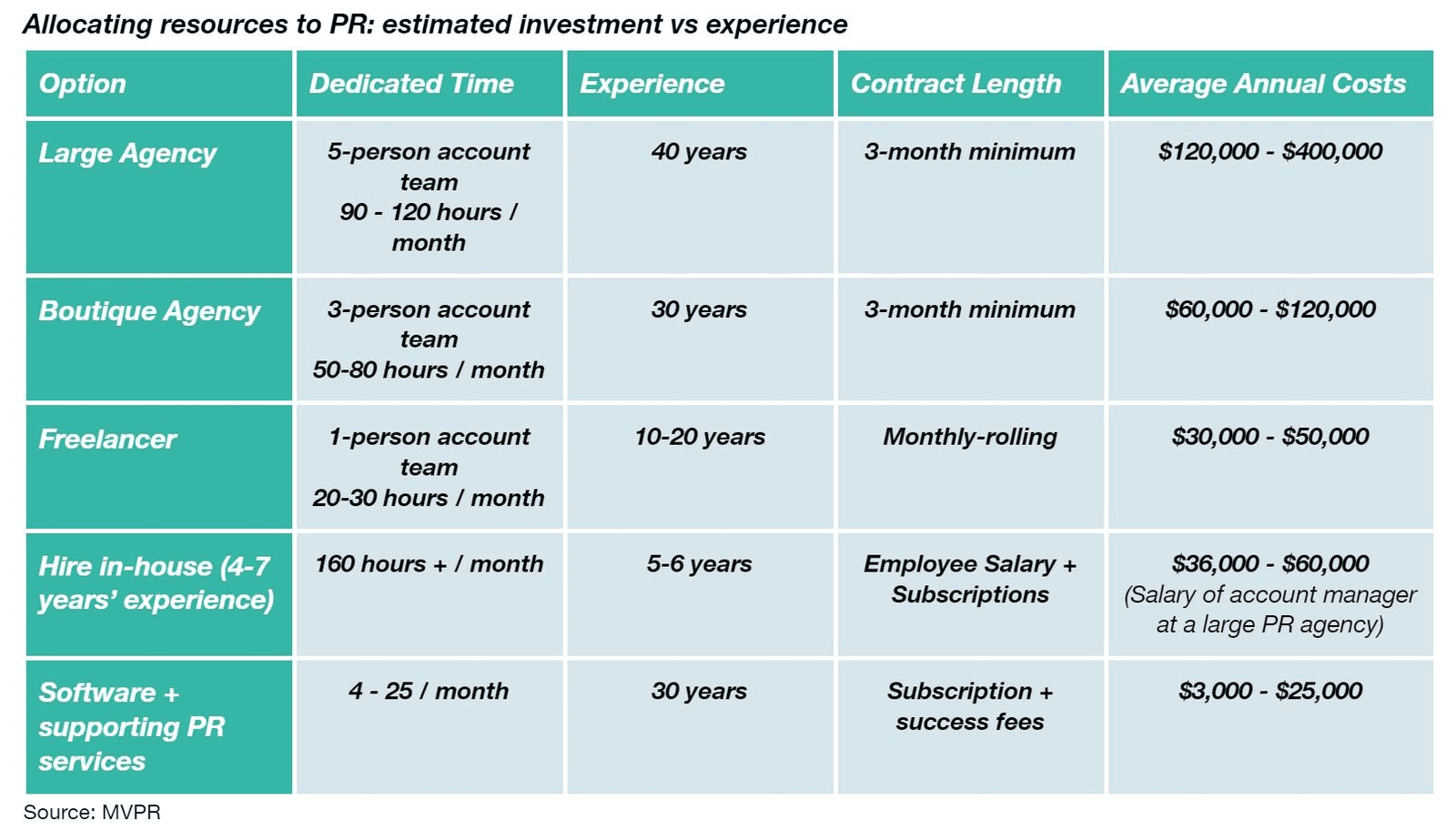 Here's a breakdown of the typical team, experience, contract length and fee range you'd get for the main PR support options available today, based on what we know: