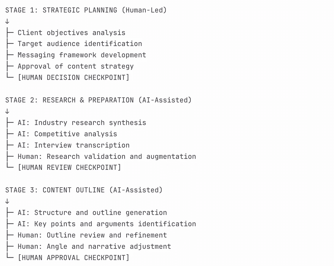 Stage 1: Strategic Planning (Human-Led) -- Client objectives analysis, target audience identification, messaging framework development. AI isn't involved here. [HUMAN DECISION CHECKPOINT]
