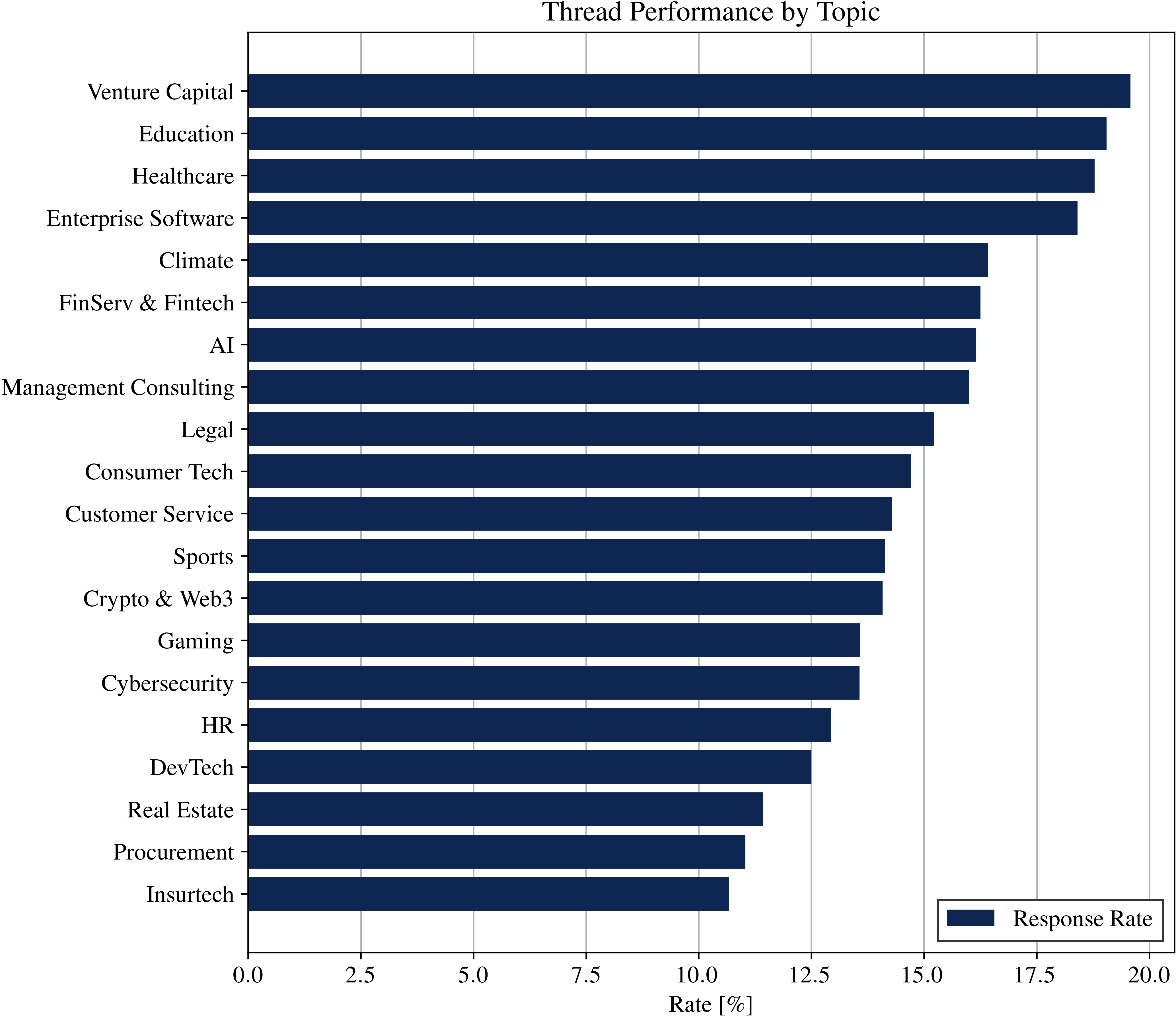 Venture Capital: Media engaging with Venture Capital topics had the highest response rates, demonstrating close to 20% response rates