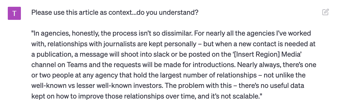 Remember, these are the early days of ChatGPT, you will always need to edit and convert the outlines you create into something original. It's still fairly obvious when companies share content with us that hasn't been edited by humans - and it will be even more obvious to journalists who receive content like this every day.